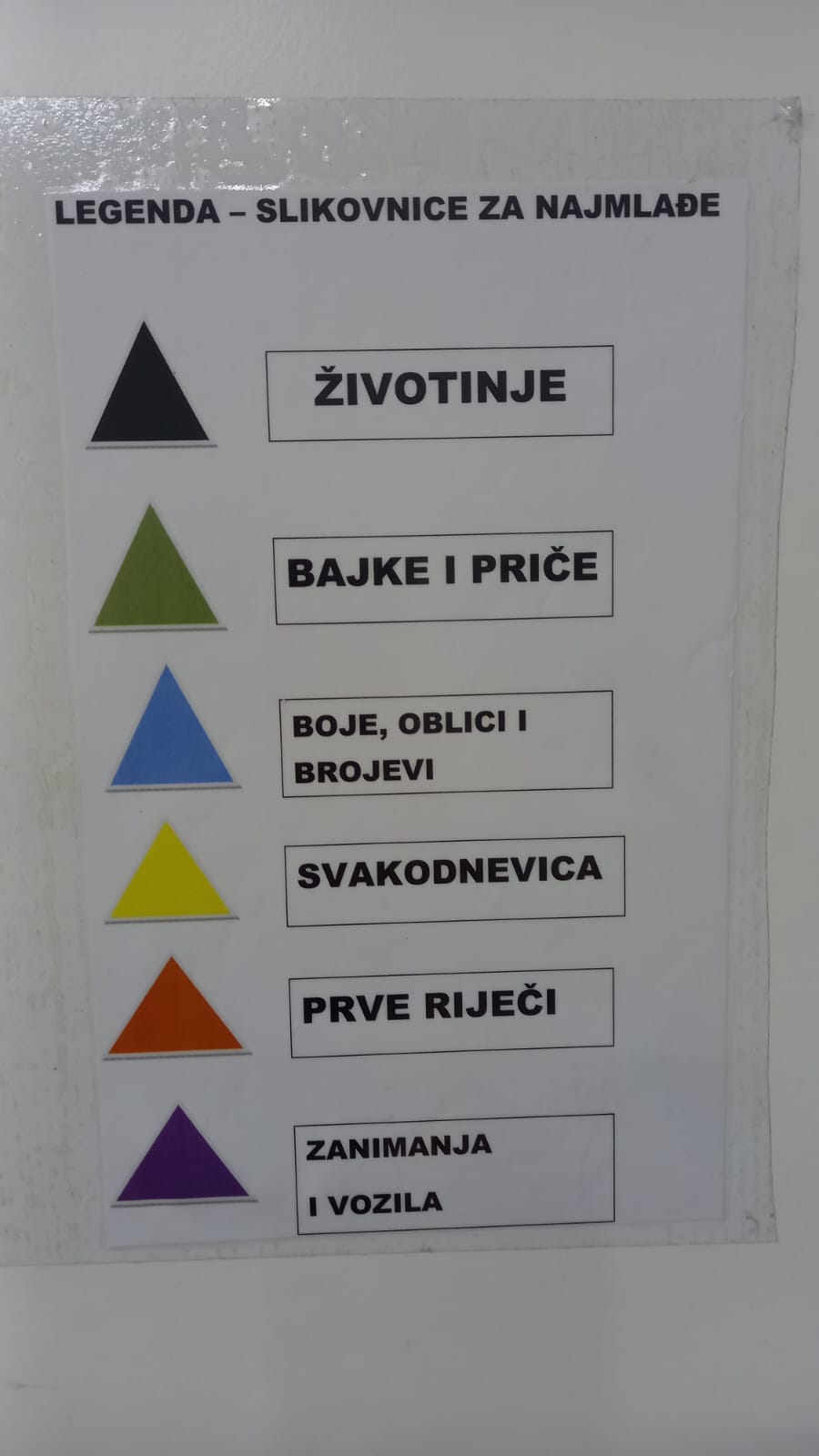 Legenda, koja je sačinjena od trokuta u boji i naziva kategorije, postavljena je na vidljivim mjestima na policama te time olakšava pretraživanje i pronalazak željenih tema.