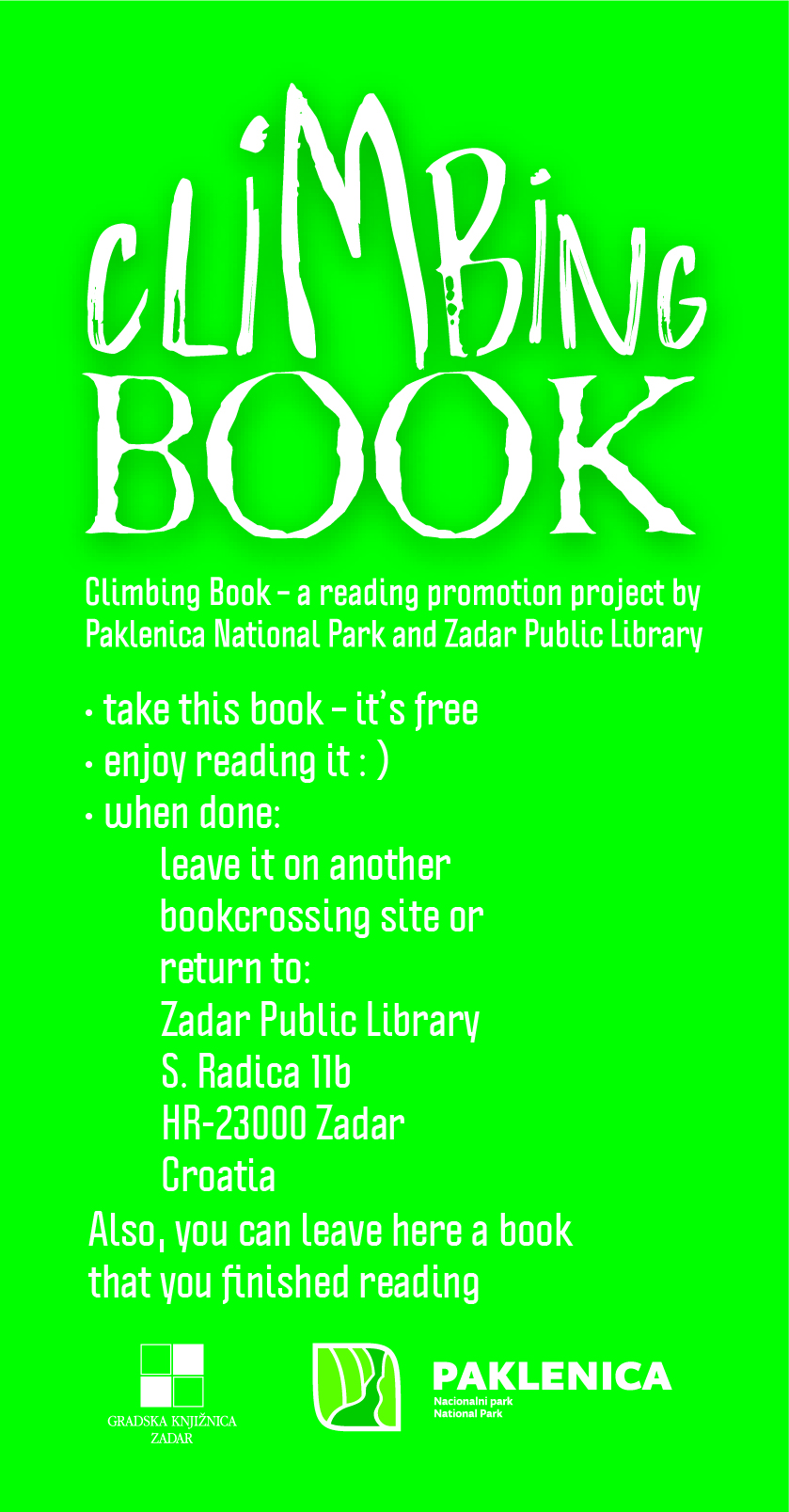 Sljedeći bookcrossing u organizaciji Knjižnice je u Nacionalnom parku Paklenica, a ostvaren je u suradnji s NP Paklenica kroz projekt “Climbing book” (knjiga penjačica) i označava početak suradnje Nacionalnog parka Paklenica i Gradske knjižnice Zadar. Knjižnica osigurava građu, a NP Paklenica police u Posjetiteljskom centru “Podzemni grad Paklenice”. Sva građa označena je ex librisima projekta “Climbing book”, dimenzija 65 x 130 mm, na kojem prevladava zelena boja kao asocijacija na zelenilo i prirodu, dok je naziv oblikovan u formi penjanja na vrh/brdo jer je park internacionalno poznat po penjačima i stijenama u kanjonu Paklenice. Tekst je napisan na engleskom jeziku i također sadrži sve potrebne podatke.