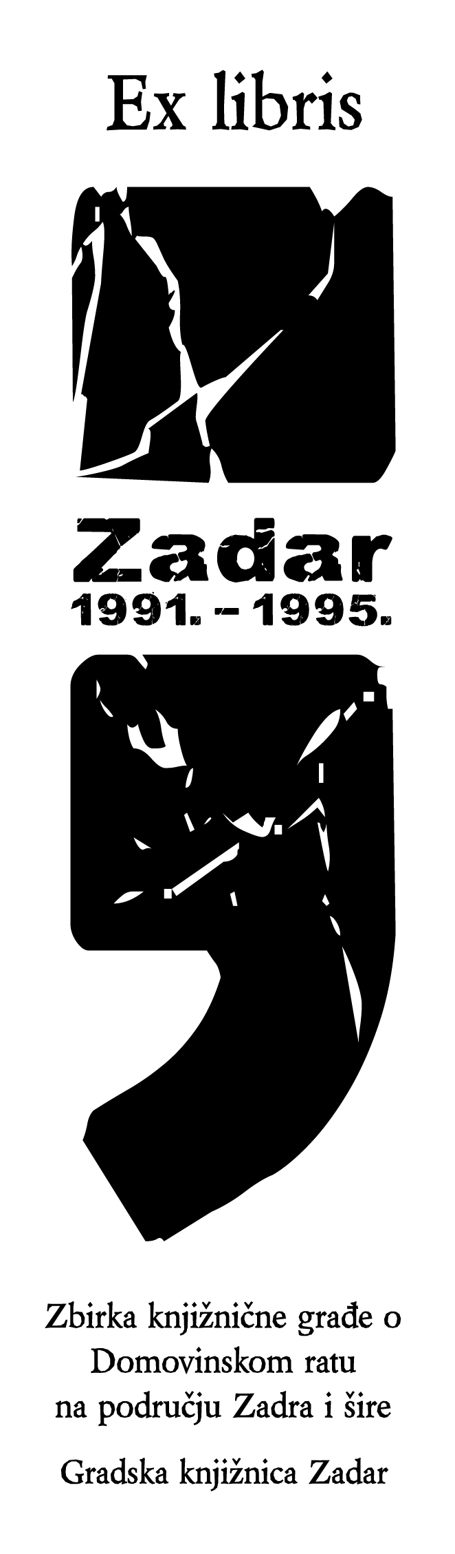 Na inicijativu ravnateljice Gradske knjižnice Zadar, Doroteje Kamber Kontić, osnovana je Zbirka knjižnične građe o Domovinskom ratu koja je javnosti predstavljena povodom obilježavanja Dana Knjižnice i Dana grada Zadra 2015. godine. Do tada građa nije bila objedinjena na jednom mjestu. Sva građa iz zbirke dobila je naljepnicu s likom golubice mira na nišanu koja se lijepi na poleđinu knjige, a sva građa iz Domovinskog rata koja se odnosi na Zadar i Zadarsko područje označena je i ex librisom dimenzija 50 x 185 mm, na kojem je kratak tekst koji objašnjava o kojem se fondu radi. Ex libris se lijepi na unutrašnjost ovitka knjige. Vizualno stiliziranim točkom i zarezom koji su isprepleteni pukotinama sugerira se na etapu u bliskoj povijesti koja je bila iznimno teška i bolna, a čiji kraj simbolizira točka, dok zarez nagovješćuje da se ide dalje, no s pukotinama/ranama.