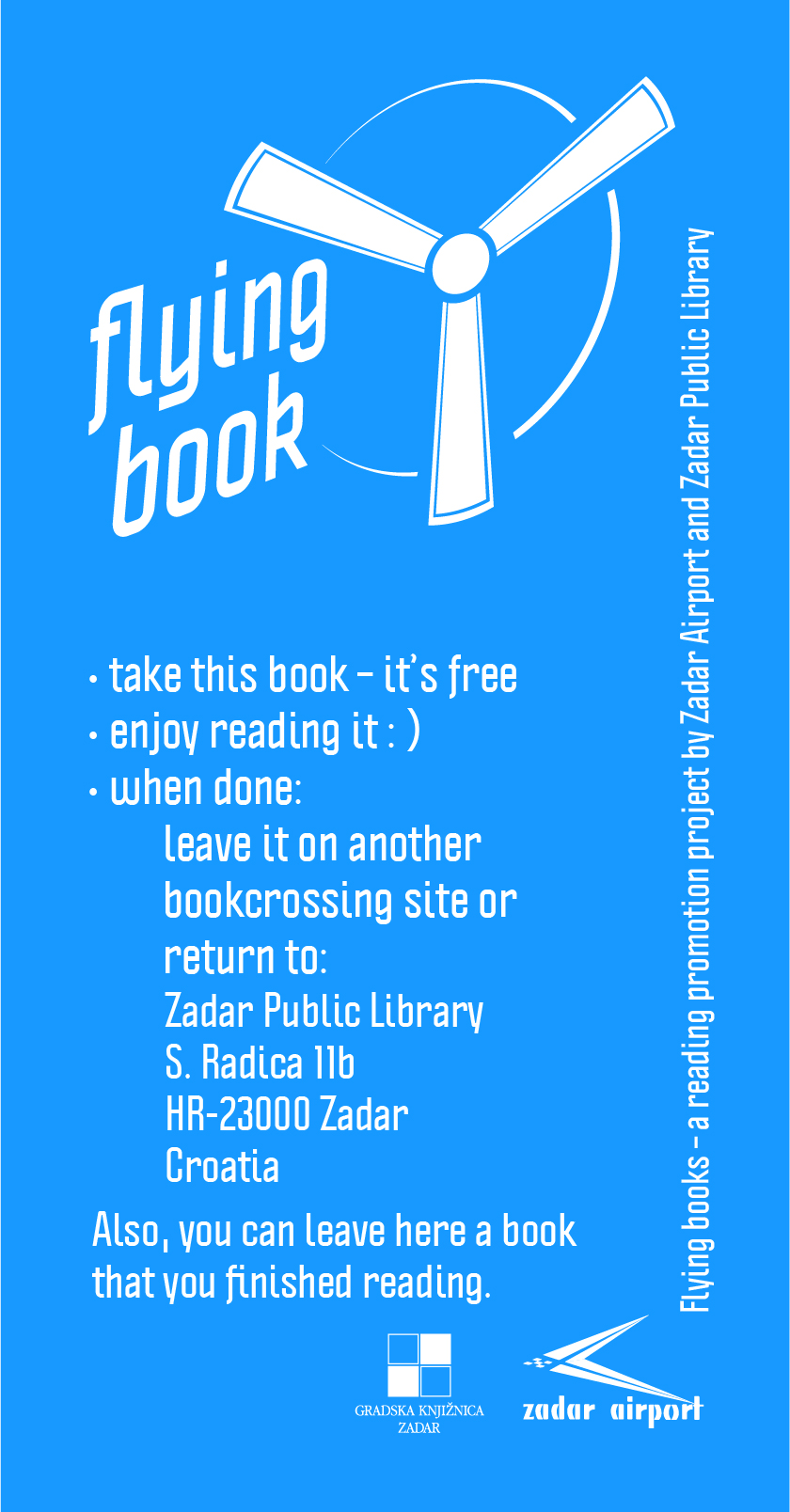Prvi ex libris koji je Knjižnica uvela u upotrebu je ex libris za bookcrossing – knjižnični projekt “Flying book” (knjiga u letu) koji se odvija u partnerstvu sa Zračnom lukom Zadar od 2015. godine. Ex libris za “Flying book” dimenzija je 65 x 130 mm, a vizualno asocira na nebo (plava boja) i letenje (propeler). Sadrži naziv projekta te sažeto sve potrebne podatke na engleskom jeziku: svrhu, način korištenja i adresu Knjižnice. Knjižni fond (većinom na engleskom jeziku) osigurava Knjižnica, a Zračna luka police te prostor u međunarodnom odlasku.