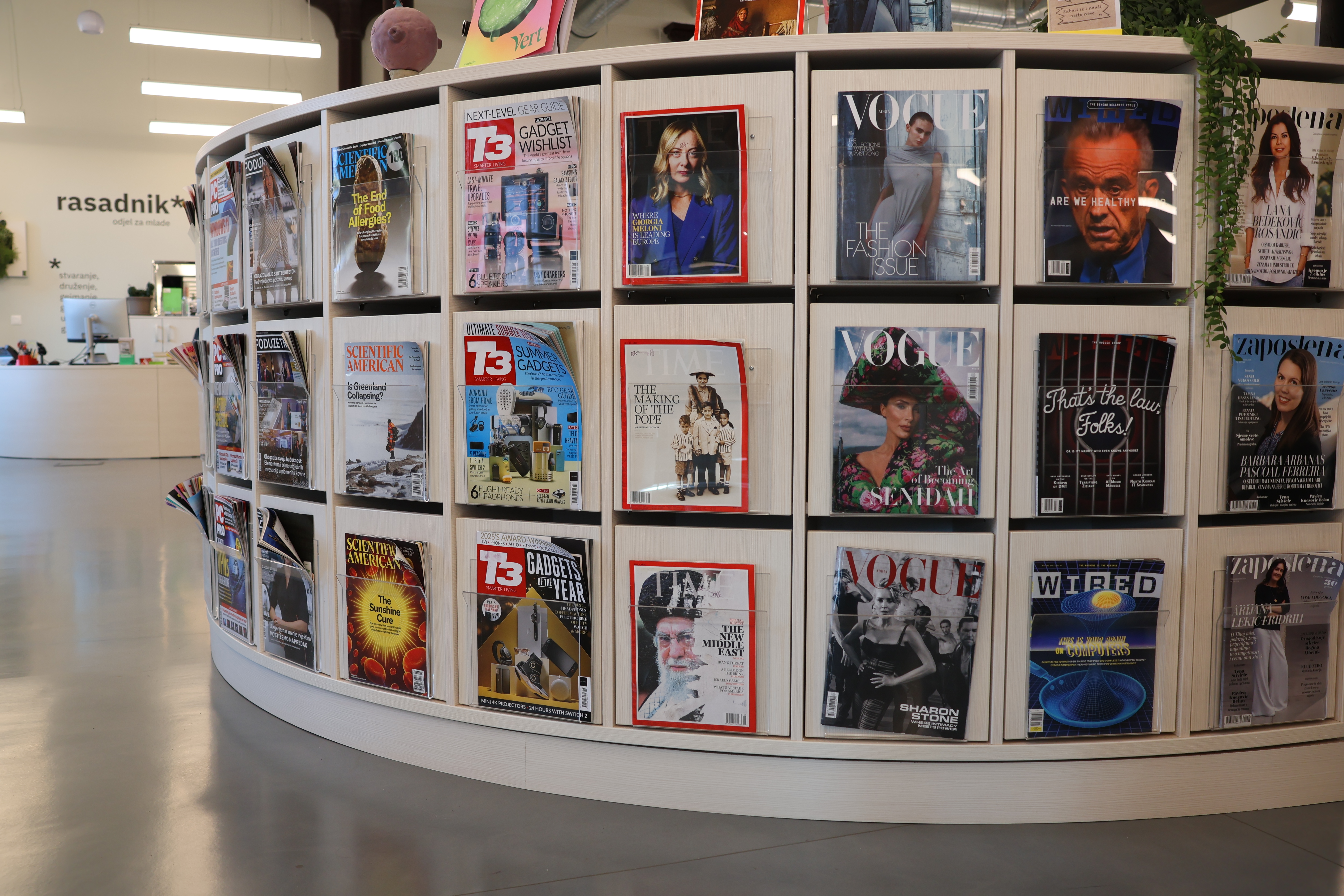Časopisi u Odjelu za mlade na hrvatskom i engleskom jeziku tematski se naslanjaju na navedene programske smjerove pa će se tako ovdje naći časopisi o glazbi, filmu, tehnologiji, popularnoj znanosti, poduzetništvu, održivosti, lifestyle časopisi i brojni drugi.