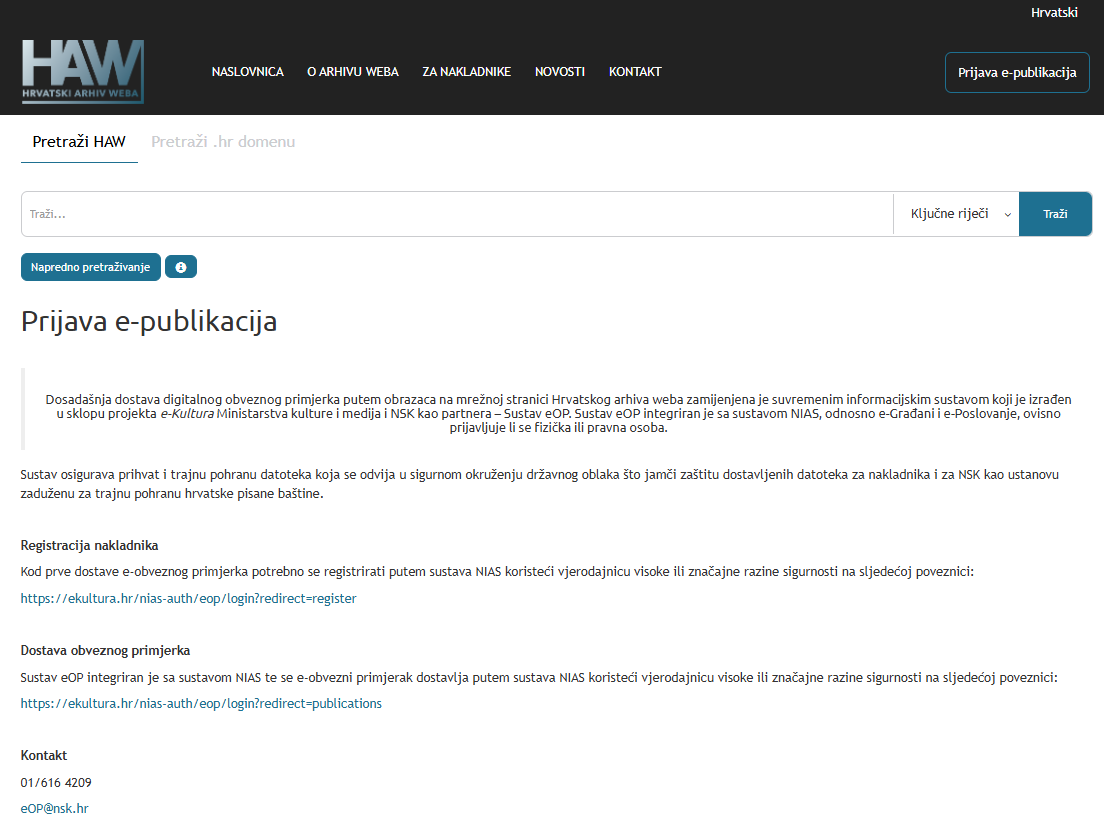 Nacionalna i sveučilišna knjižnica u Zagrebu u lipnju 2024. godine uspostavila je informacijski sustav za prihvat i trajnu pohranu obveznog primjerka svih vrsta e-publikacija – sustav eOP. Prikupljanje i dostava obveznog primjerka e-publikacija zadaća je NSK i nakladnika, propisana Zakonom o knjižnicama i knjižničnoj djelatnosti (NN 17/2019, 98/2019, 114/2022, 36/2024) te Pravilnikom o obveznom primjerku (NN 66/2020).